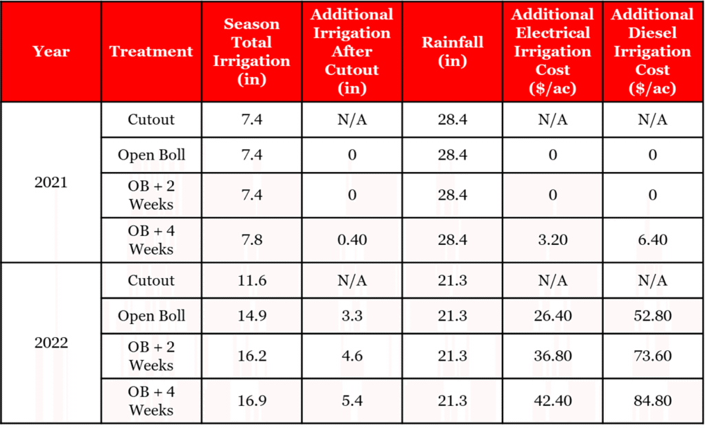 The table below shows the result of the study from the economic perspective. I used the previously mentioned irrigation cost data to calculate the cost of additional irrigation applications at the end of the season. Remember, there were not significant differences in yield, so I did not consider lint yield profit differences in this calculation, only irrigation.